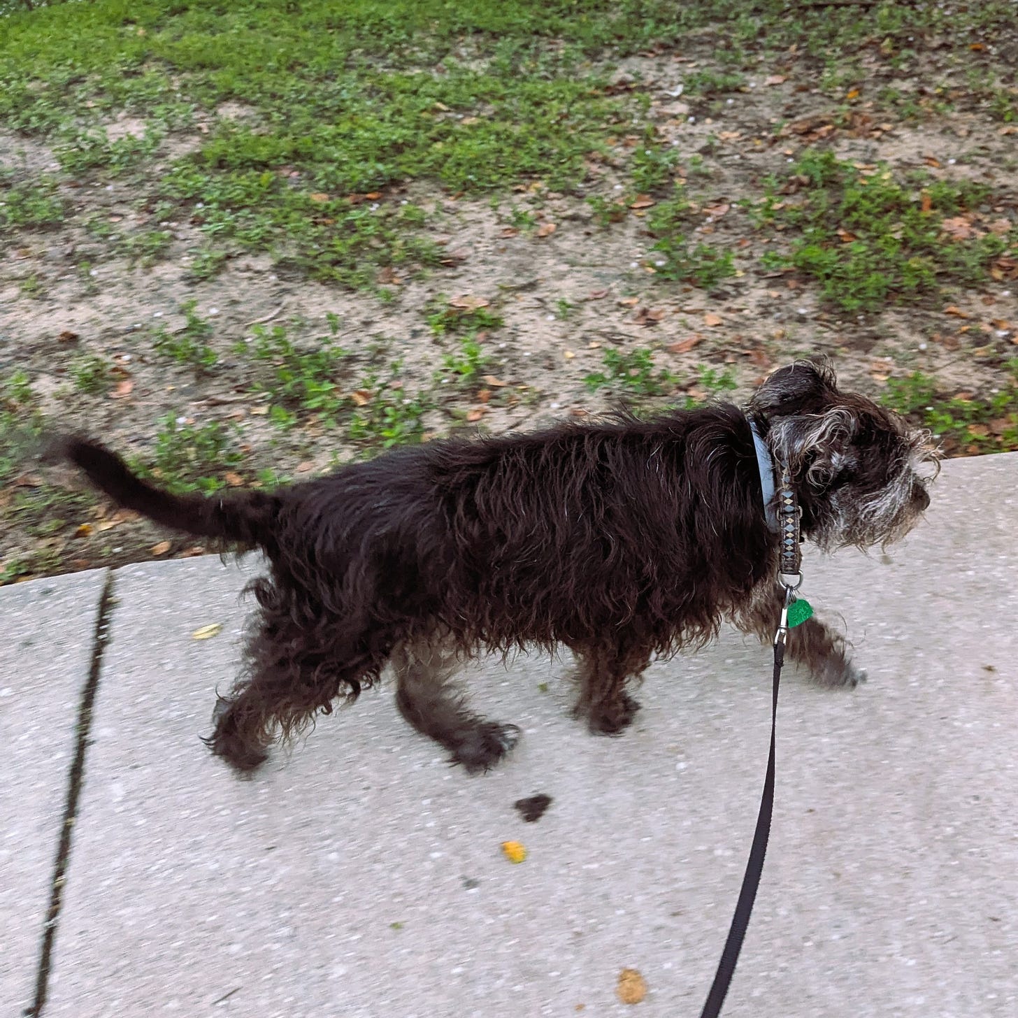 Not much to report on Keely! She’s doing well, overall. Still a bit of incontinence so she’s restricted to doggy diapers, which she does not love. At all. It just means she enjoys her walks all the more, since she gets to be diaper-free! Here is a recent action shot, taken during out morning walk. Due to the heat I’ve usually been taking her out before dawn, but this was post-hurricane so it was cool(er) out, even with the sun up.