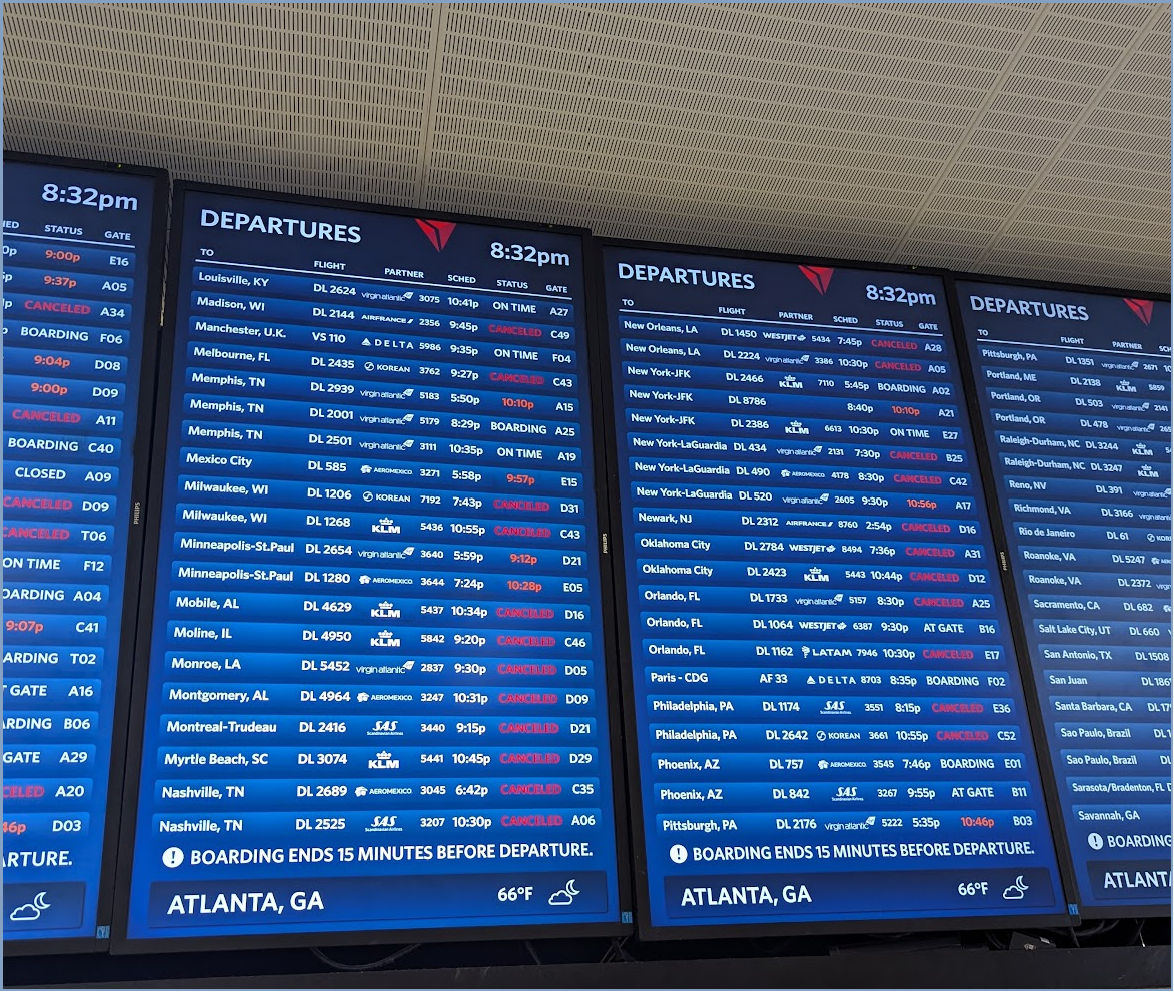 More later, when I’ve recovered from the trip! And yes, my return was marked by sleeping overnight in Terminal T at the Atlanta airport due to 1) bad weather causing me to miss my connection; 2) all the cancelled flights, e.g.: