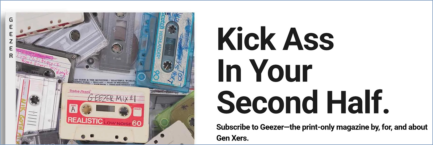 AND WE’RE BACK! A friend sent me a link to a new print-only GenX zine, GEEZER. Immagonna sign up. Maybe send them an actual paper check, for the vibes.